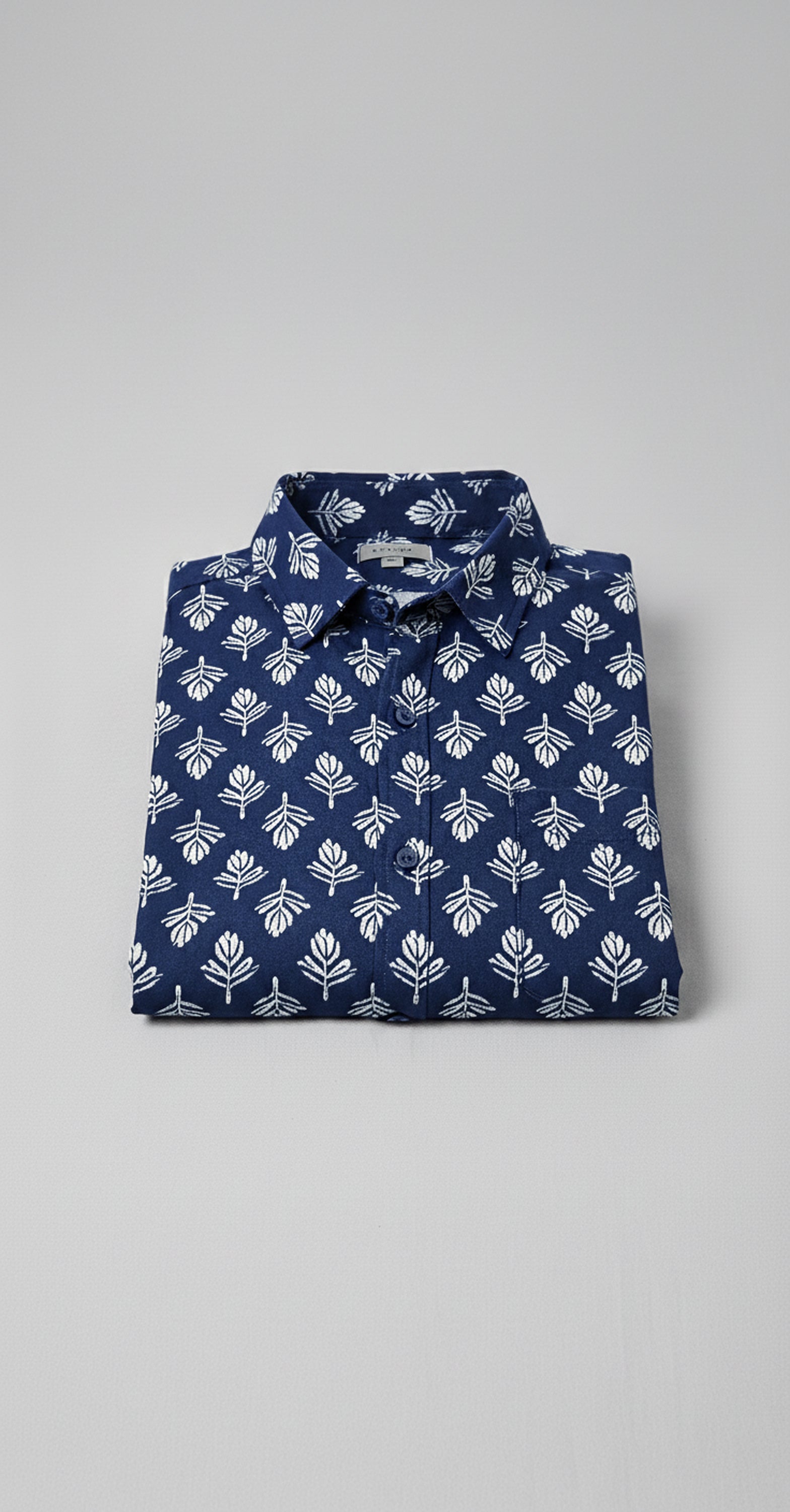 Heritage & Craft Details: Botanical motifs in textiles trace their origins to ancient civilizations, where leaf patterns symbolized growth, renewal, and connection to nature. In Indian textile tradition, botanical prints flourished during the Company School period when European botanists commissioned local artists to document India’s rich flora using natural dyes and traditional block printing techniques. Each shirt is crafted using time-honored hand block printing methods on premium cotton fabric. Skilled artisans carve intricate wooden blocks and apply eco-friendly dyes, celebrating India’s 450-year legacy of sustainable textile craftsmanship while preserving the delicate beauty of natural foliage patterns.