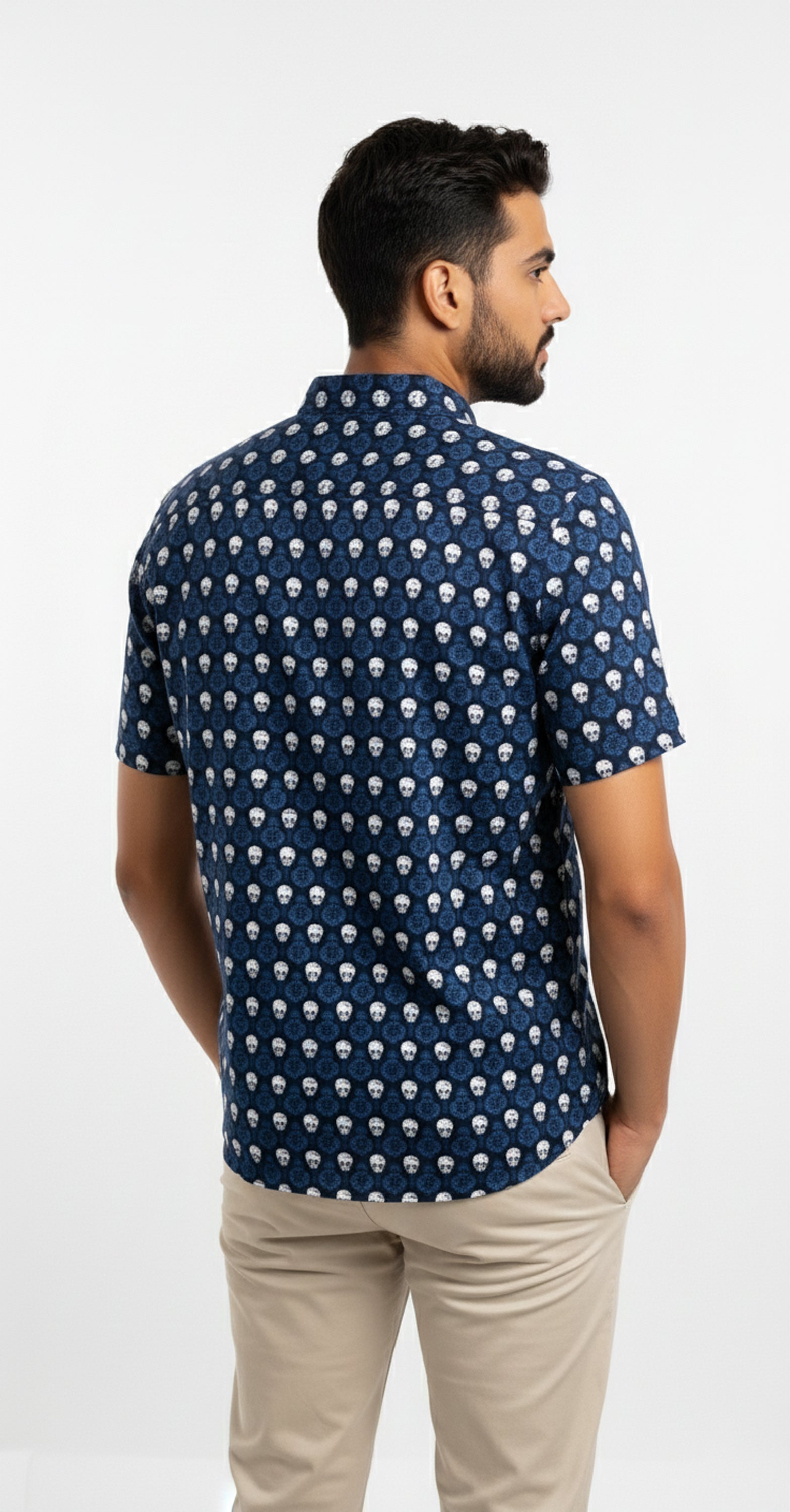 Make an edgy statement with this bold half-sleeve shirt featuring stylized skull motifs in striking navy and white contrast. Crafted from premium breathable cotton for comfort and attitude in one package. Pair with black jeans and leather boots for a rock-inspired look, or style with dark chinos and sneakers for alternative casual appeal. Layer under a denim jacket for weekend rebellious vibes, or wear it open over a plain black tee for modern street-style edge.